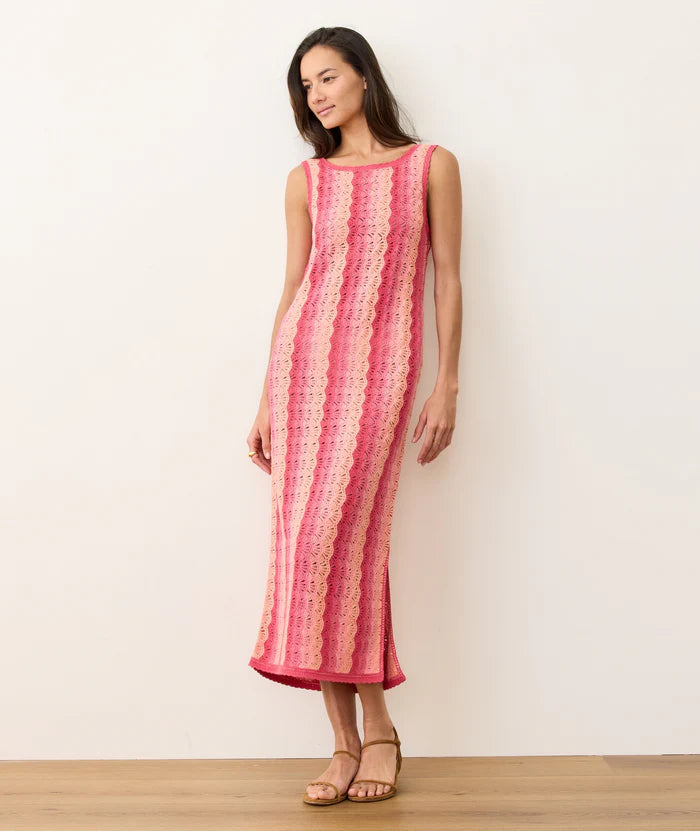 Sunset, but make it a dress. This airy column dress is made from our crochet shell stitch in a punchy pink-orange hue that's basically like wearing a golden hour. It’s got a breezy boat neck, a scooped low back, and a midi length that works barefoot at the beach or dressed up for a summer soirée. Just add sandals, it's that simple.